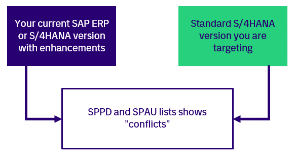The reason for this is fairly straightforward: if your enhancements are done safely – and isolated from standard SAP ABAP code – then your SPPD/SPAU lists will be short during the upgrade project. The SPPD/SPAU lists are generated by SAP upgrade tools, and they contain “conflicts” between custom enhancements and standard S/4HANA.