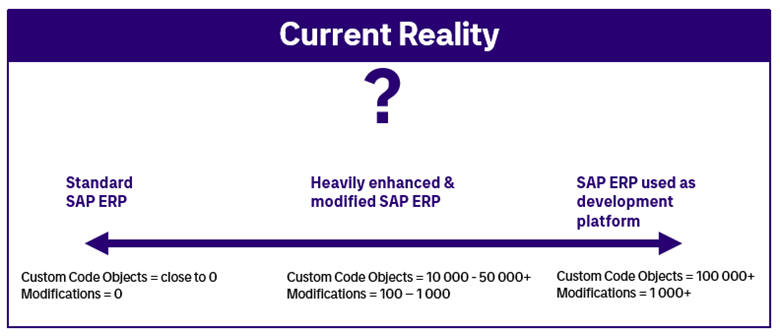 When you know your numbers for “Total Custom Code Objects” and “Total Modifications”, you can position your SAP ERP in the horizontal axis of picture 2 (below). I highly recommend doing so, as it will help you “Accept your destiny” and make the right choices moving forward.